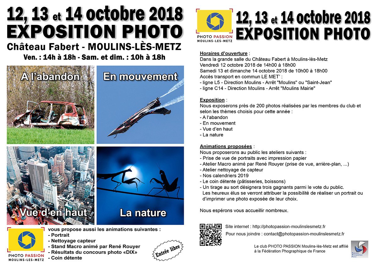 LES PHOTOGRAPHES DE PHOTO PASSION MOULINS-LES-METZ EXPOSENT PLUS DE 200 CLICHES A PARTIR DU 12 OCTOBRE 2018 AU CHATEAU FABERT A MOULINS-LES-METZ.